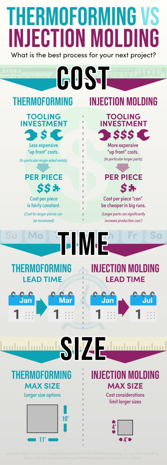 As the worlds leader in custom thermoformed solutions, Penda focuses on creating durable thermoformed products. However, thermoforming is not the only process to create plastic products. We explore the differences between thermoforming and injection molding, covering everything from cost to lead time, this infographic shows a run-down of what you should take into account when choosing a process.